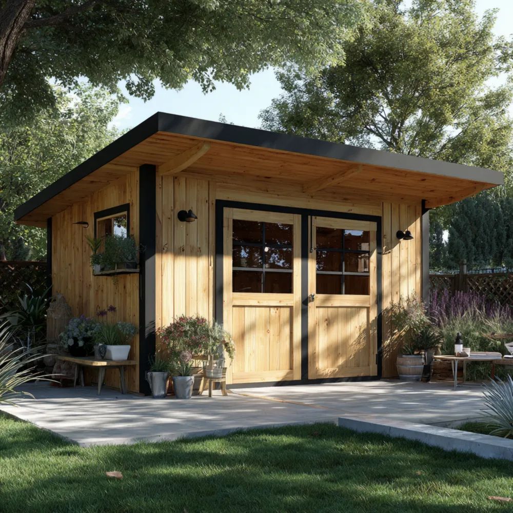 Unser Gartengeräteschuppen aus Holz bietet optimalen Stauraum für Ihre Gartengeräte und Werkzeuge. Das moderne Design fügt sich harmonisch in jede Gartenlandschaft ein.